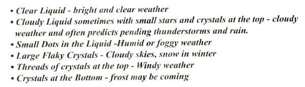 しかし、私の製品では、結晶のでき方の変化はわずかで、ほとんどの状態が底の結晶が溜まった状態で、羽毛状の結晶の長さが少し変化する程度の変化なので、この説明書の記述と実際の天気は全く合致していません。(家の中ですから、霧、雪、霜などはわかりません)